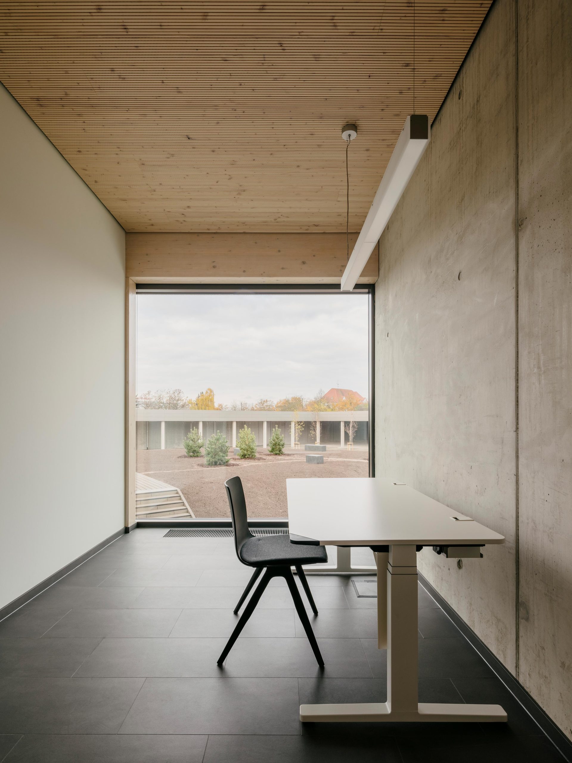 Am höchsten Punkt befindet sich ein mit Kiefern bestandenes Plateau. Dieser besondere Ort grenzt direkt an die große Terrasse der Aufenthalts- und Besprechungsräume an. Die Mitarbeiter können über landschaftliche Stufen oder die Wiese den Kiefernhain von jedem Ort auf kürzestem Wege erreichen.