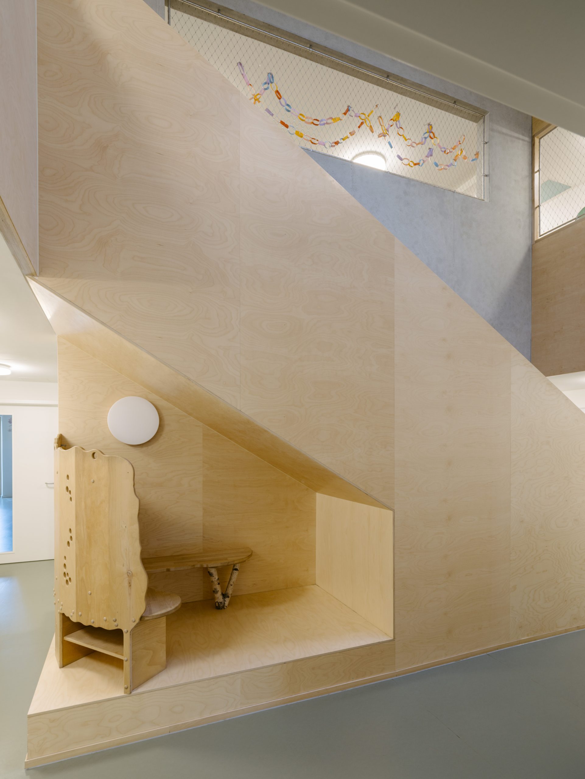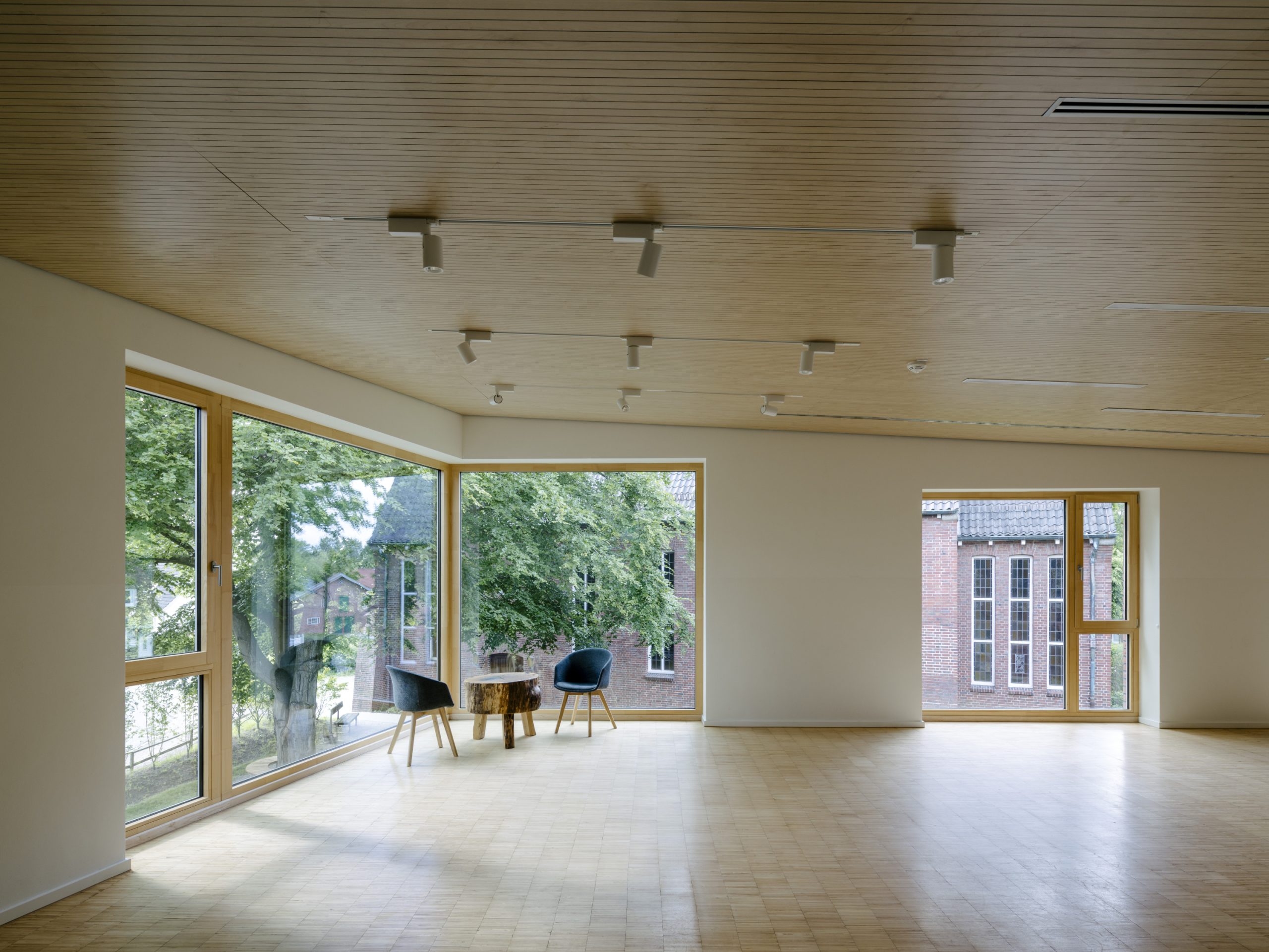 Das Kirchengebäude mit seinem markanten Kirchturm ist für das neue Gemeindeforum ein prägender visueller Bezugspunkt voller Identität. Großzügige Öffnungen des Gemeindehauses und des Wohnungsbaus sind so platziert, dass Kirche und Kirchturm als starkes identitäres Element wirken können. Das Gemeindehaus ist in unmittelbarer Nähe zur Kirche angeordnet, die Kita schließt sich direkt im Süden an.