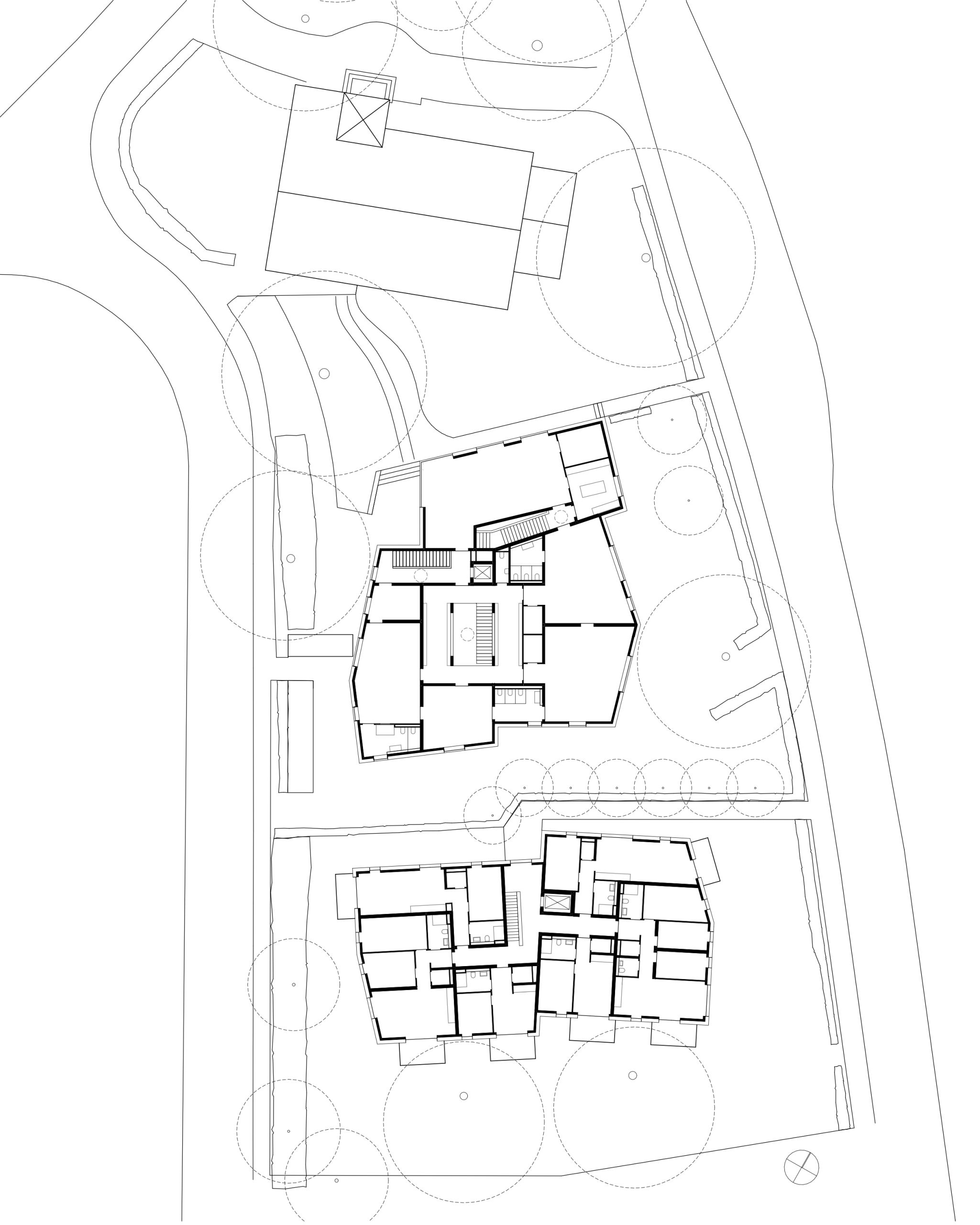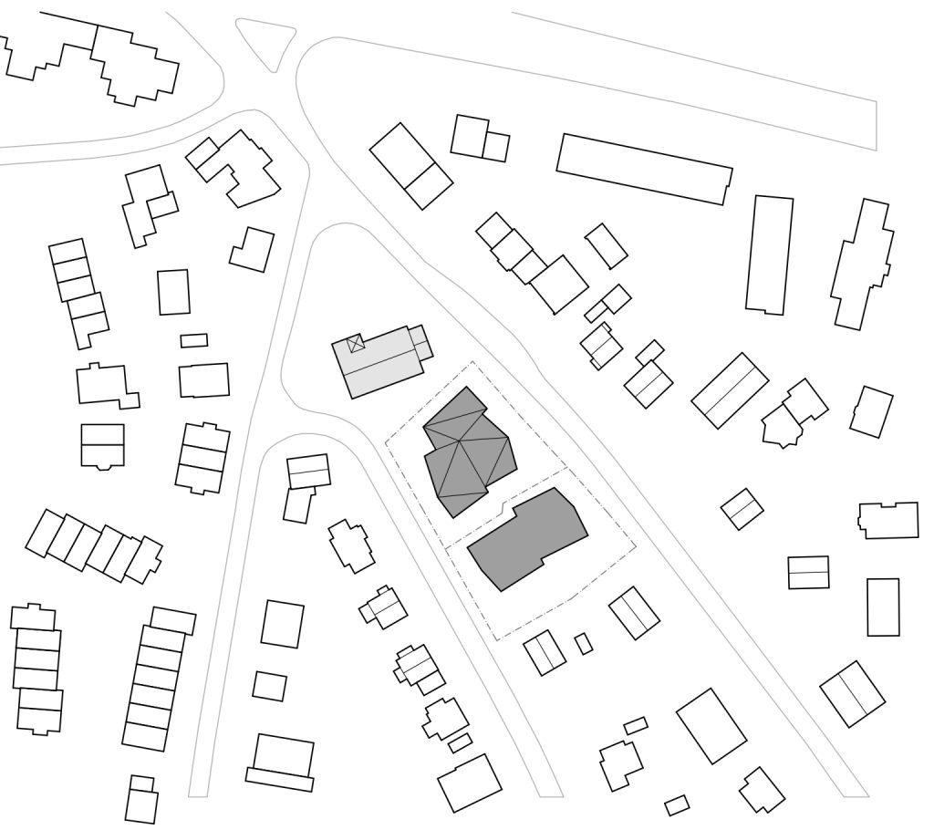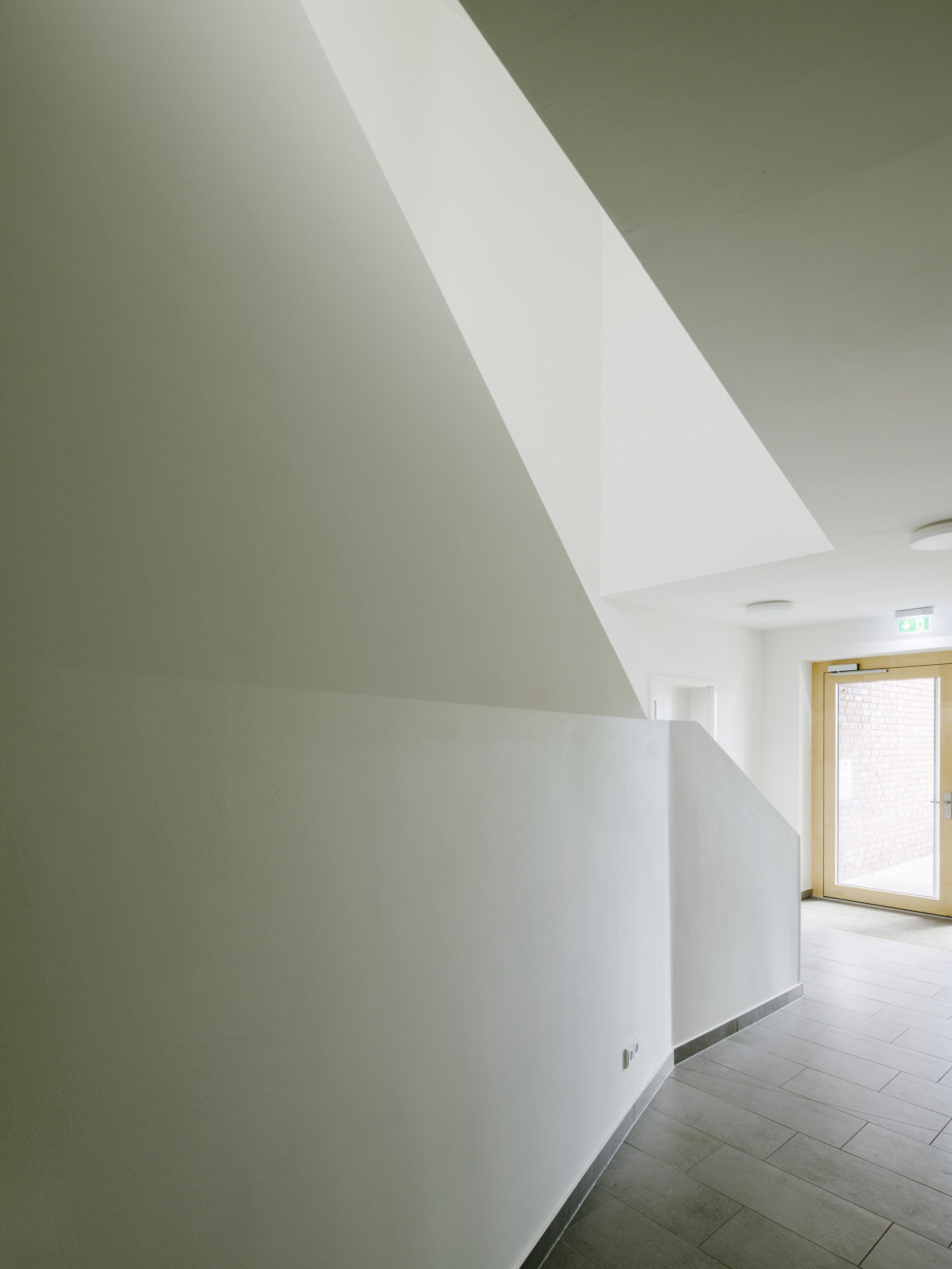 Die beiden Neubauten sind in ihrer bewegten Formensprache sehr eigenständig, fügen sich durch Vor- und Rücksprünge sowie Dachneigungen aber sehr harmonisch und rücksichtsvoll in die umliegende Bebauungsstruktur ein. Die gefalteten Dächer bilden straßenseitige Giebel aus, die einen unmittelbaren Bezug zur Nachbarschaft herstellen und klare, ablesbare Adressen etablieren.