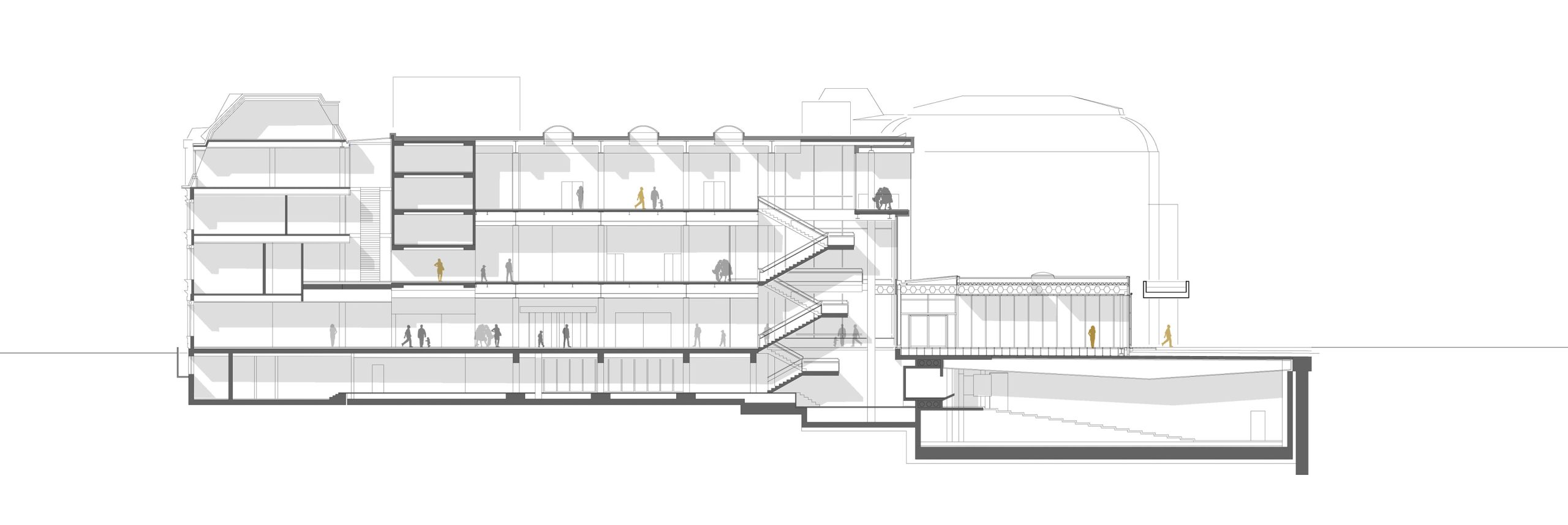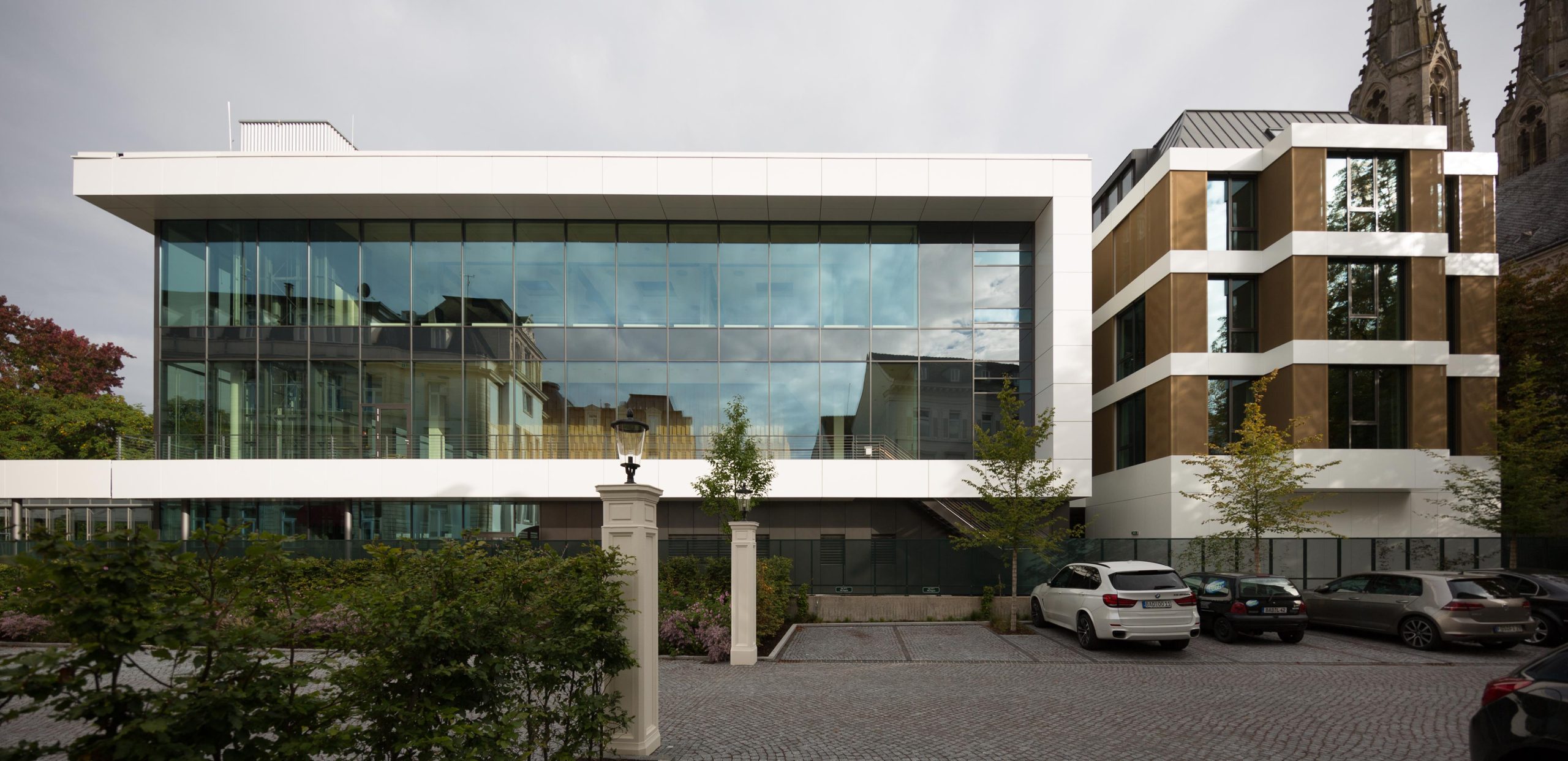 Es entsteht eine klar ablesbare Gebäudestruktur, die durch differenzierte Öffnungsgrade und Transparenzen die vielfältigen Innenräume außen ablesbar macht. Zugleich bildet sie ein jeweils angemessenes architektonisches Gegenüber zum heterogenen städtischen Umfeld, insbesondere auch zur weltberühmten Flaniermeile Lichtenauer Allee.