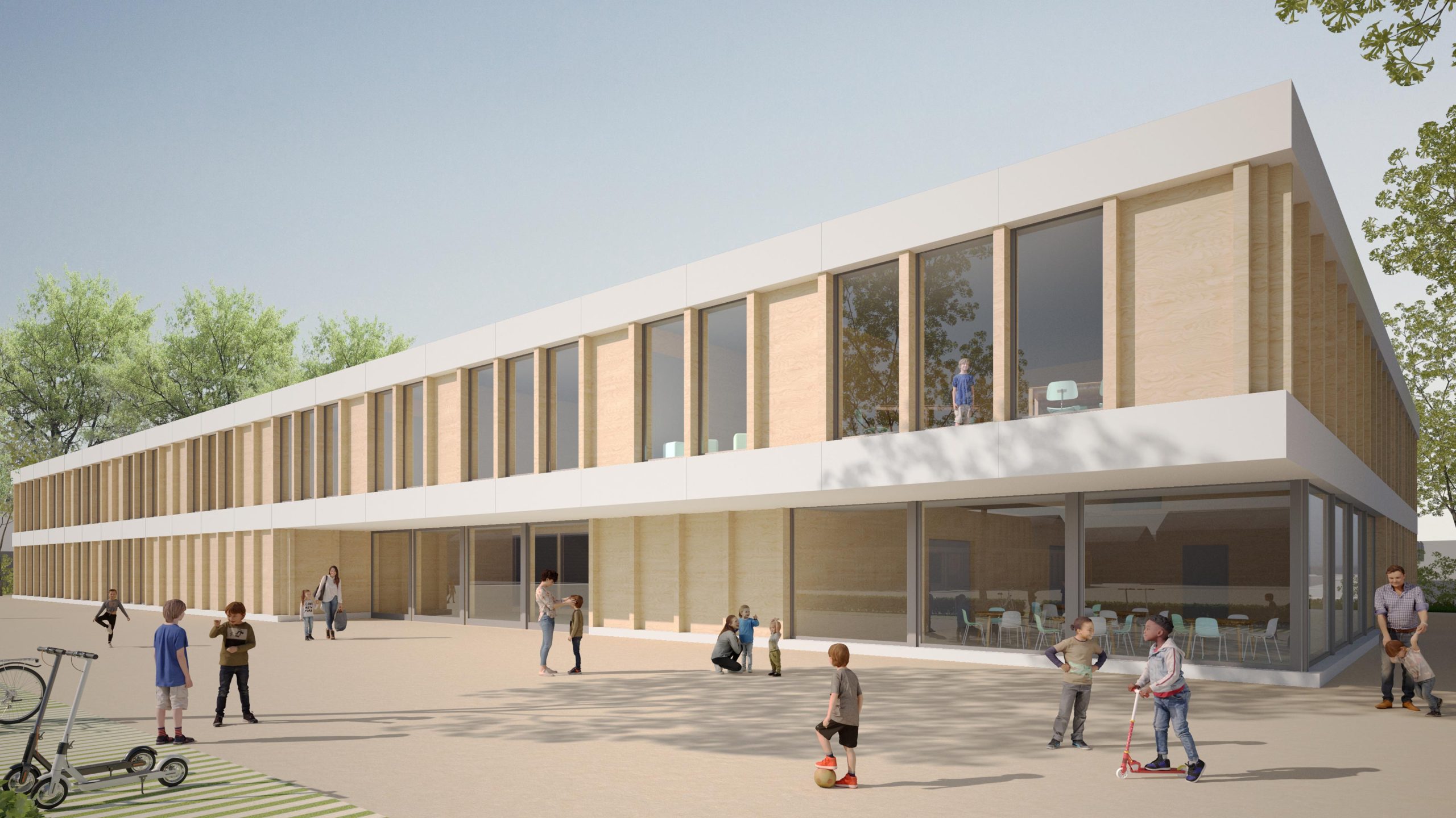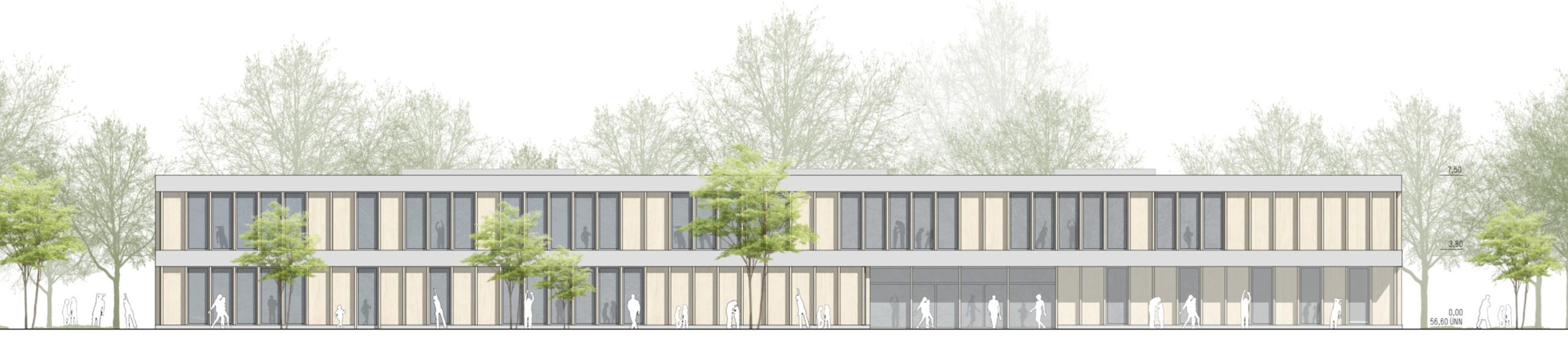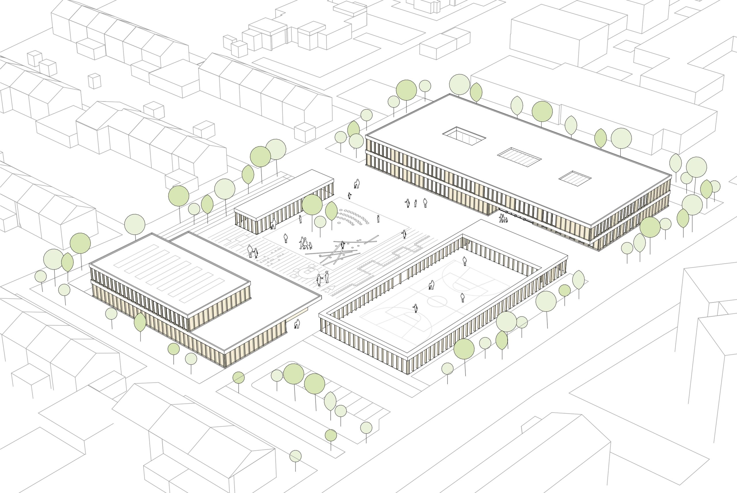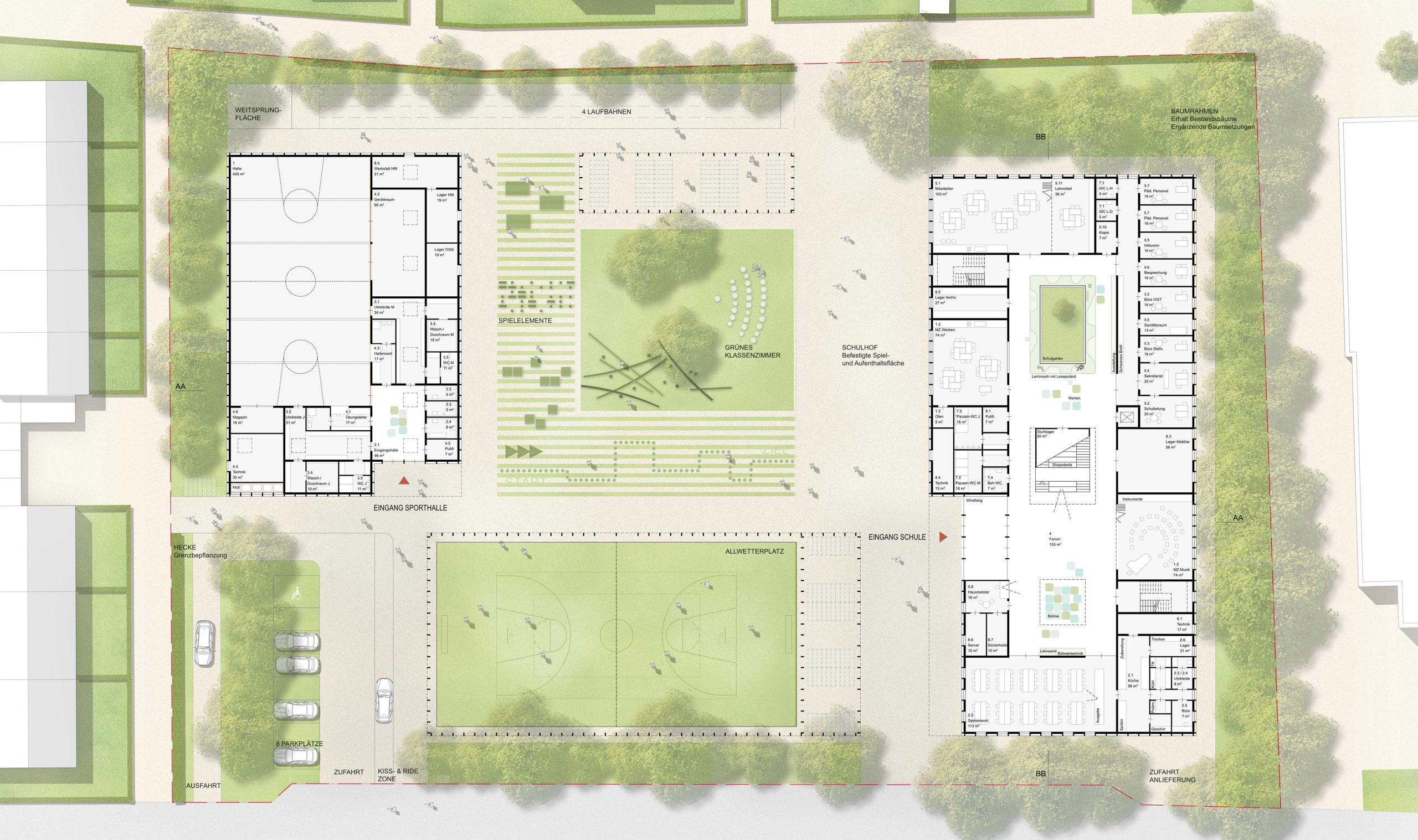 Im Anschluss wird die Bestandsschule abgebrochen und das Schulgebäude um die Sporthalle sowie die neuen Freianlagen-Flächen ergänzt.