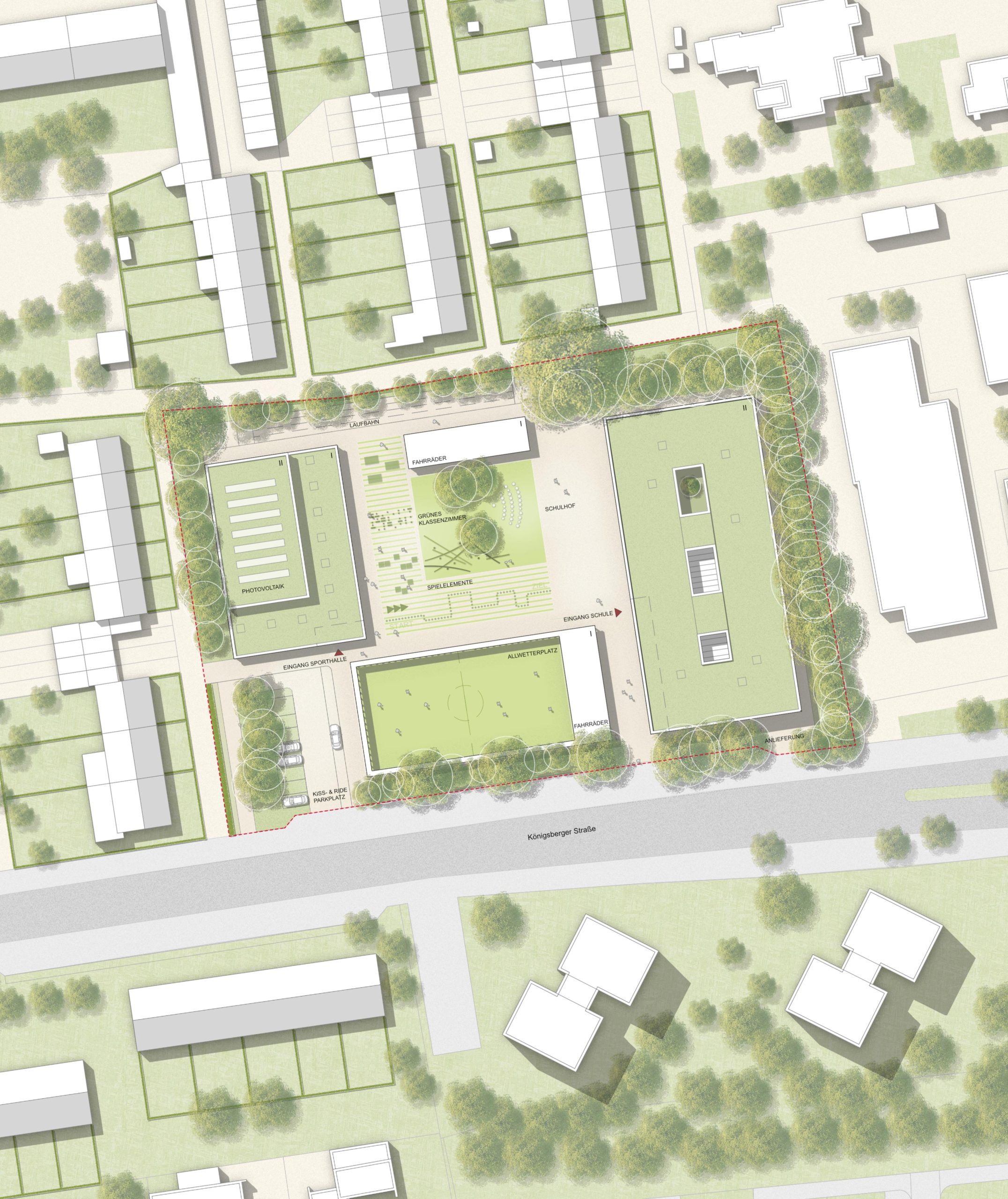 Der wertvolle, für die Schule identitätsstiftende Baumbestand rahmt das gesamte Gelände und bettet die künftige Bebauung harmonisch in die gewachsene Umgebung ein.