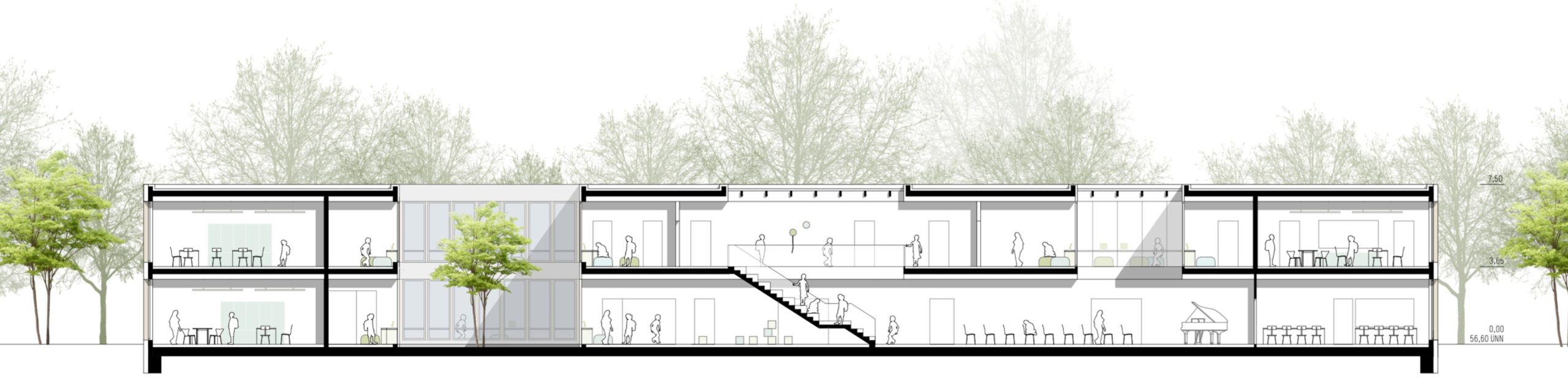Auf dem Grundstück der Melanchthonschule in Münster-Coerde entsteht ein neu sortiertes Ensemble aus Schulgebäude, Einfeldsporthalle und Kleinspielfeld, welches schrittweise die Bestandsbebauung von Schule und Sporthalle im Ortstausch ersetzt. Das Herzstück dieser Komposition bildet der gemeinsame grüne Schulhof, der die einzelnen Gebäude miteinander verbindet.