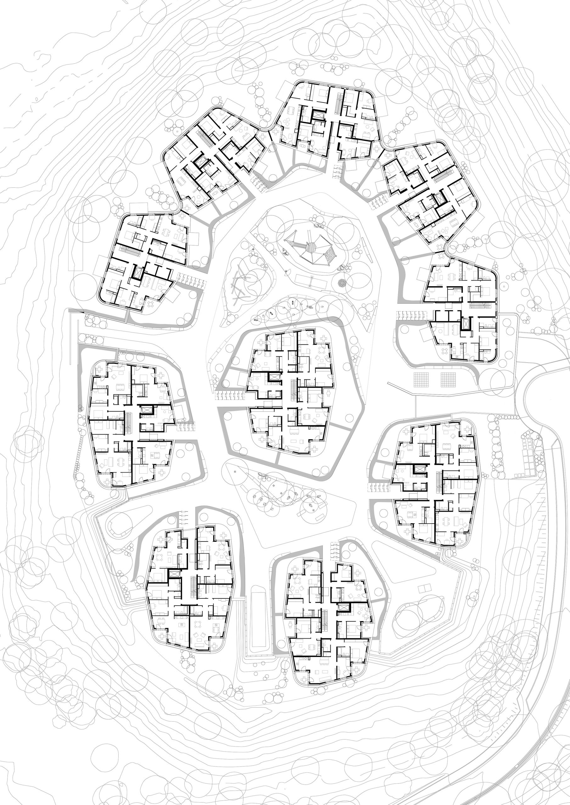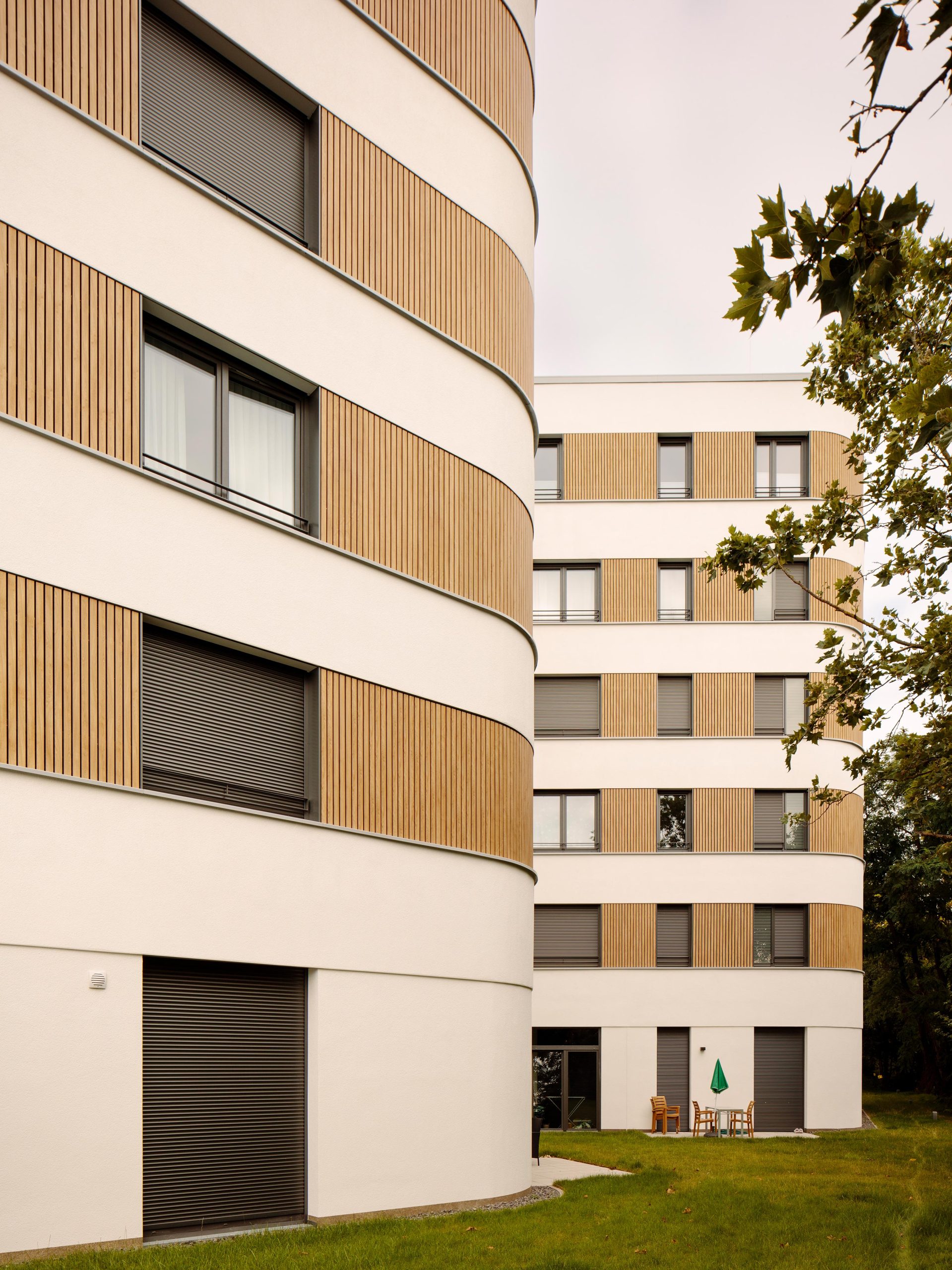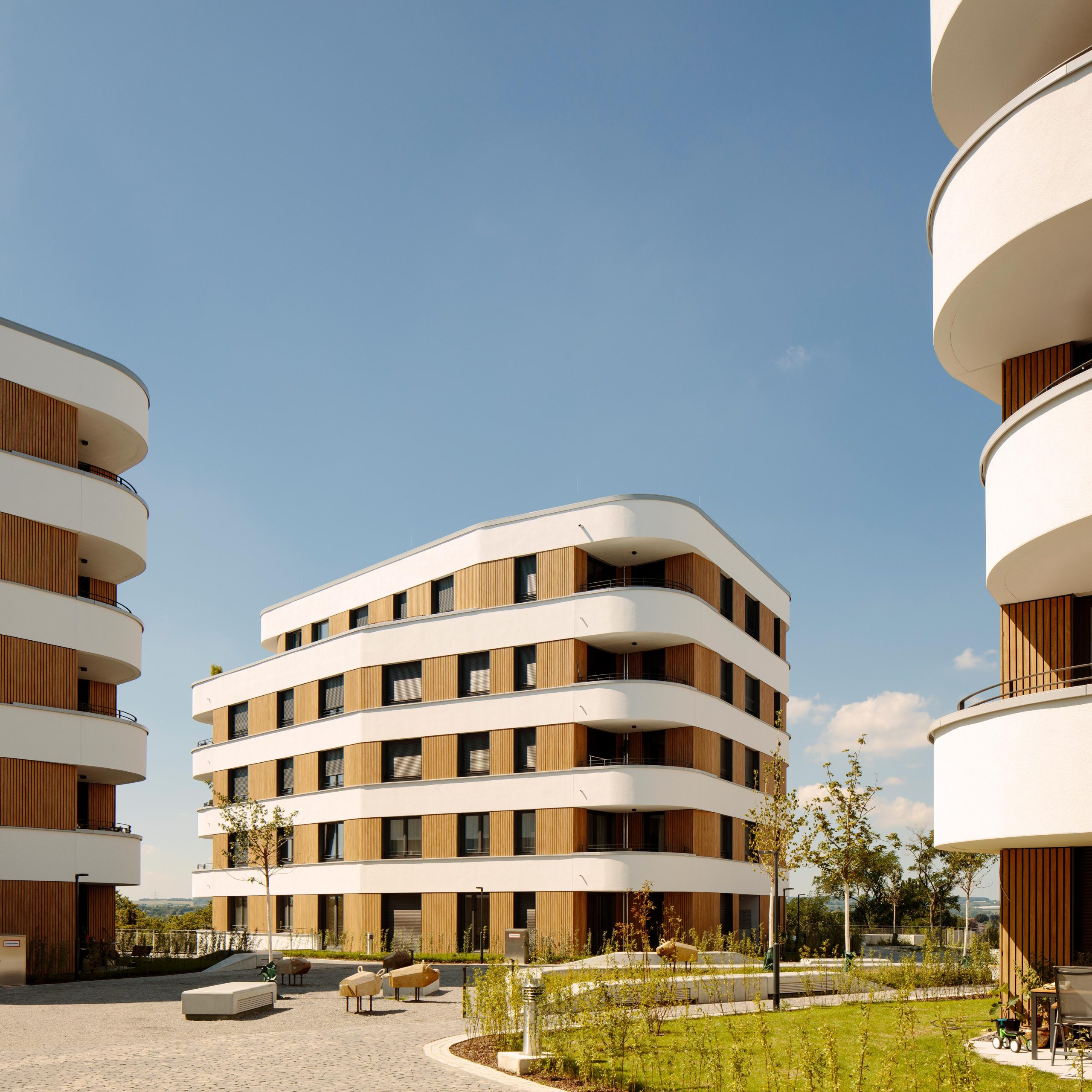 Zehn in ihrer Positionierung und gerundeten Ausformung sehr eigenständige Baukörper mit insgesamt 205 Wohnungen formulieren ein Gebäudeensemble, eingebettet in grüne Bestandsbäume und dem Verkehr weit enthoben. Jede Wohnung besitzt durch die versetzte Stellung der Baukörper den für den Ort so besonderen Fernblick. Die Besonderheit der geographischen Lage sorgt für eine außergewöhnliche Aufenthaltsqualität in den großzügigen, gemeinschaftlich nutzbaren Freiräumen.