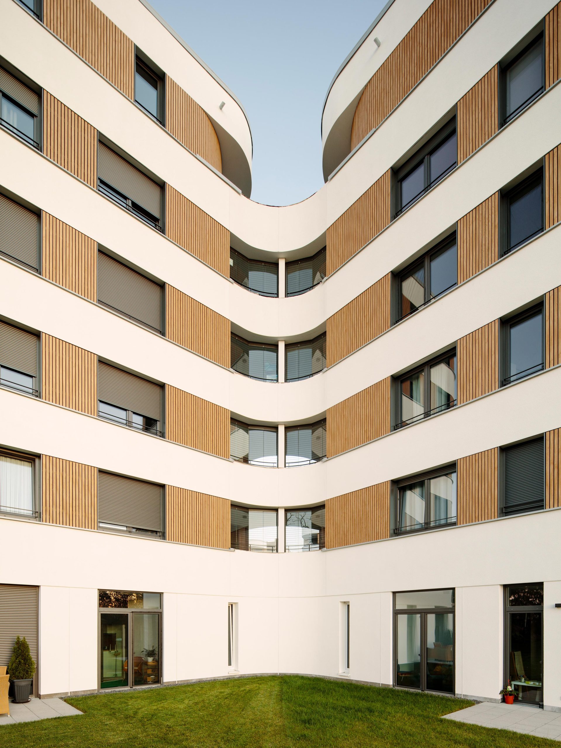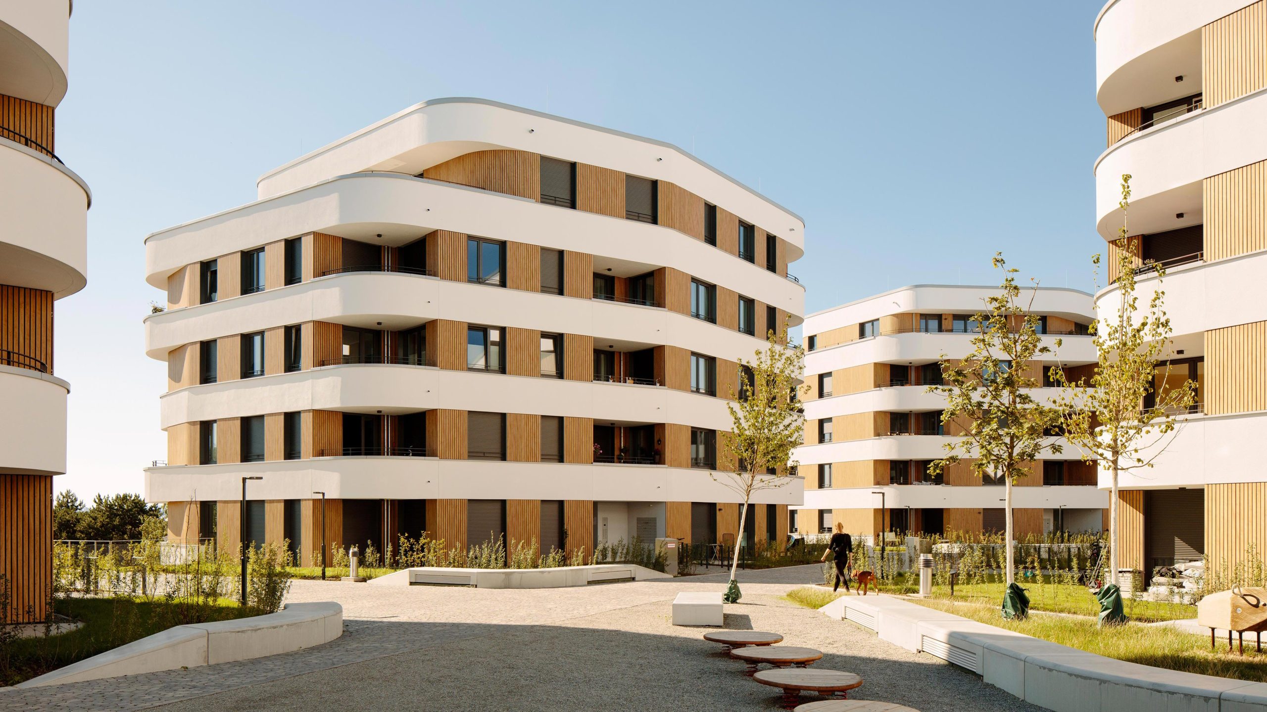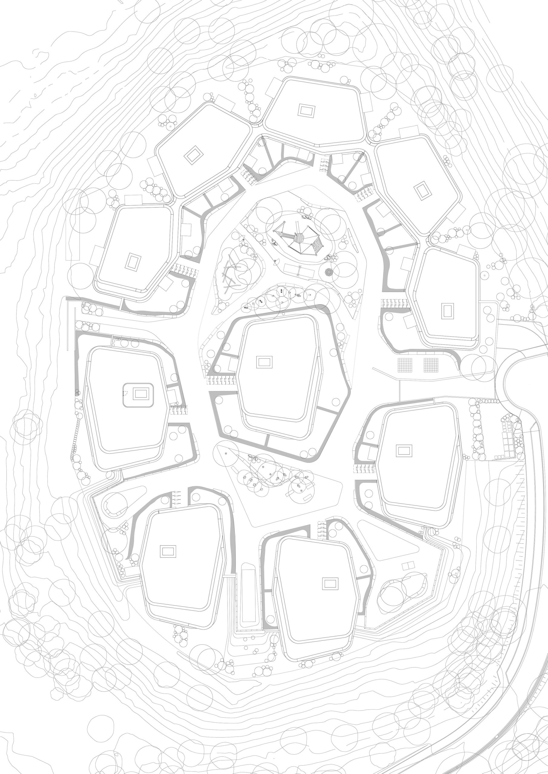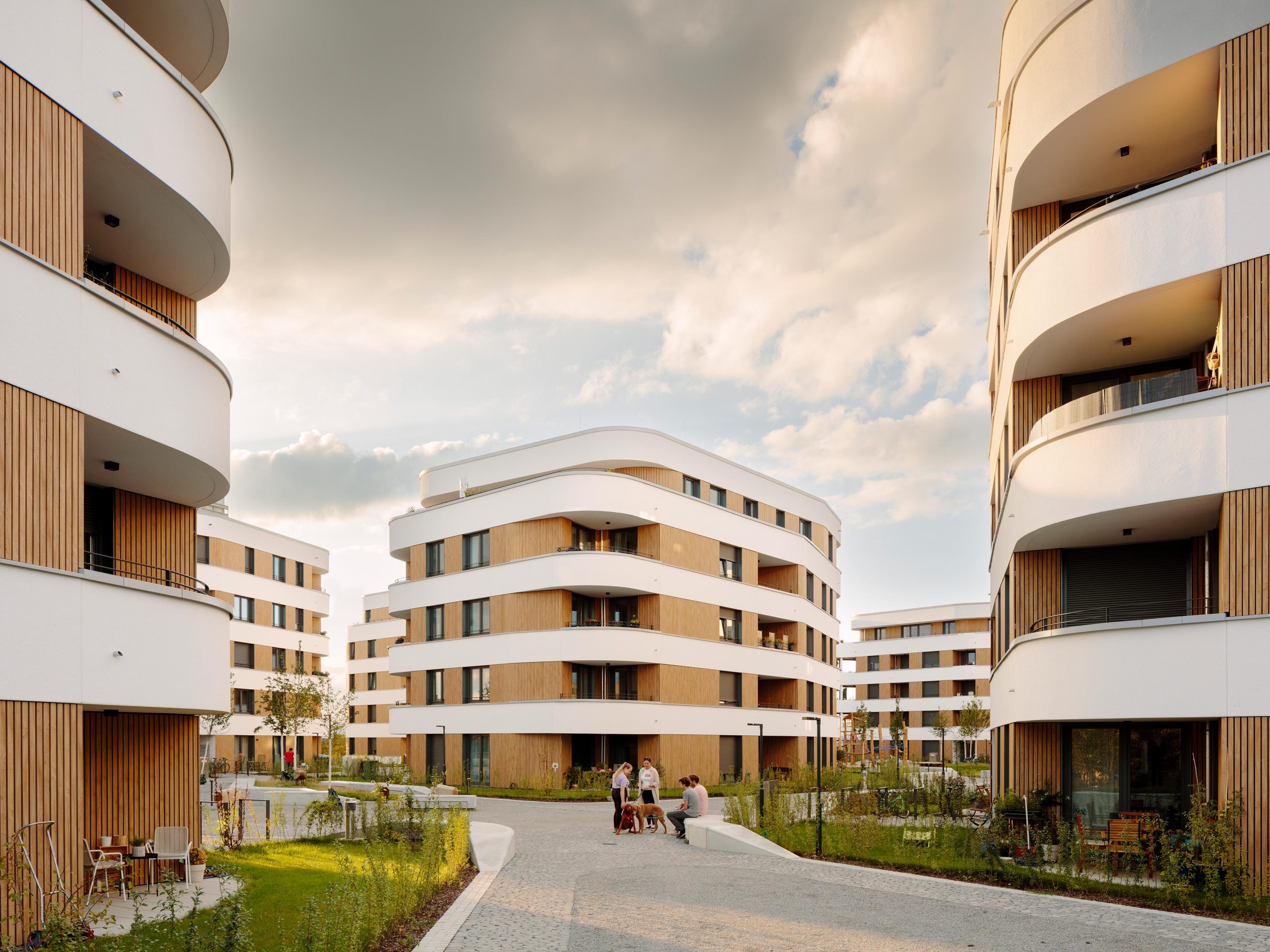 Zehn in ihrer Positionierung und gerundeten Ausformung sehr eigenständige Baukörper mit insgesamt 205 Wohnungen formulieren ein Gebäudeensemble, eingebettet in grüne Bestandsbäume und dem Verkehr weit enthoben. Jede Wohnung besitzt durch die versetzte Stellung der Baukörper den für den Ort so besonderen Fernblick. Die Besonderheit der geographischen Lage sorgt für eine außergewöhnliche Aufenthaltsqualität in den großzügigen, gemeinschaftlich nutzbaren Freiräumen.