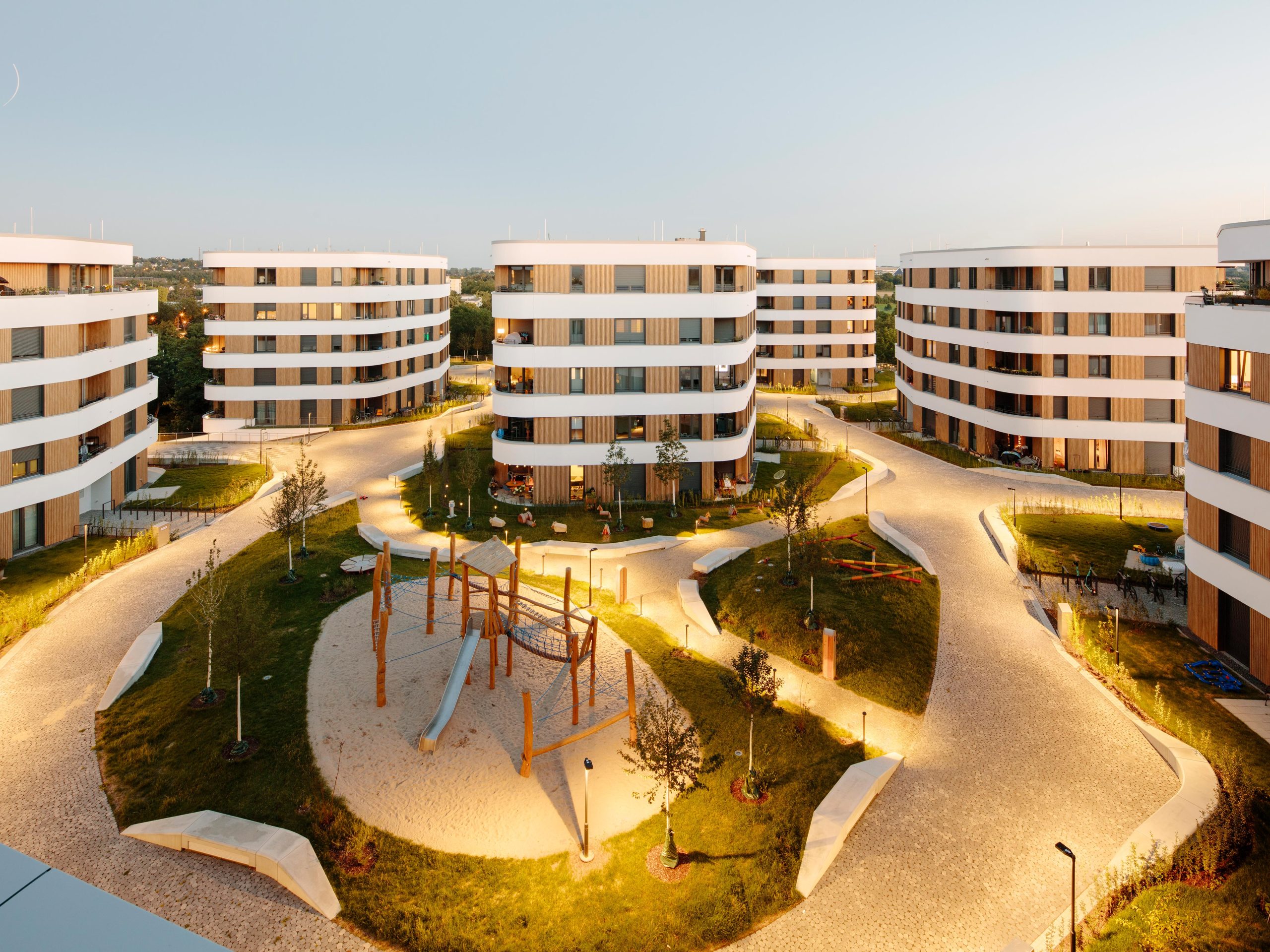 Auf dem Plateau des Rodelbergs wurde ein lebenswertes, familienfreundliches und nachhaltiges Wohnquartier realisiert, mit Blicken über die Dächer der Stadt Mainz bis zum Dom und in die umliegenden Weinberge.