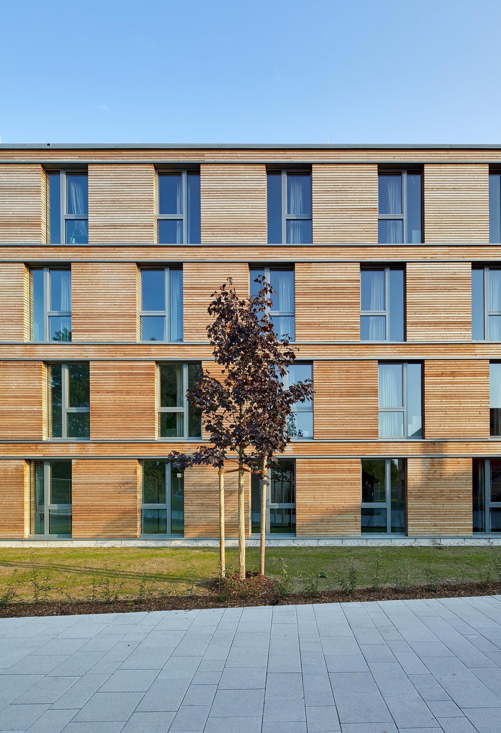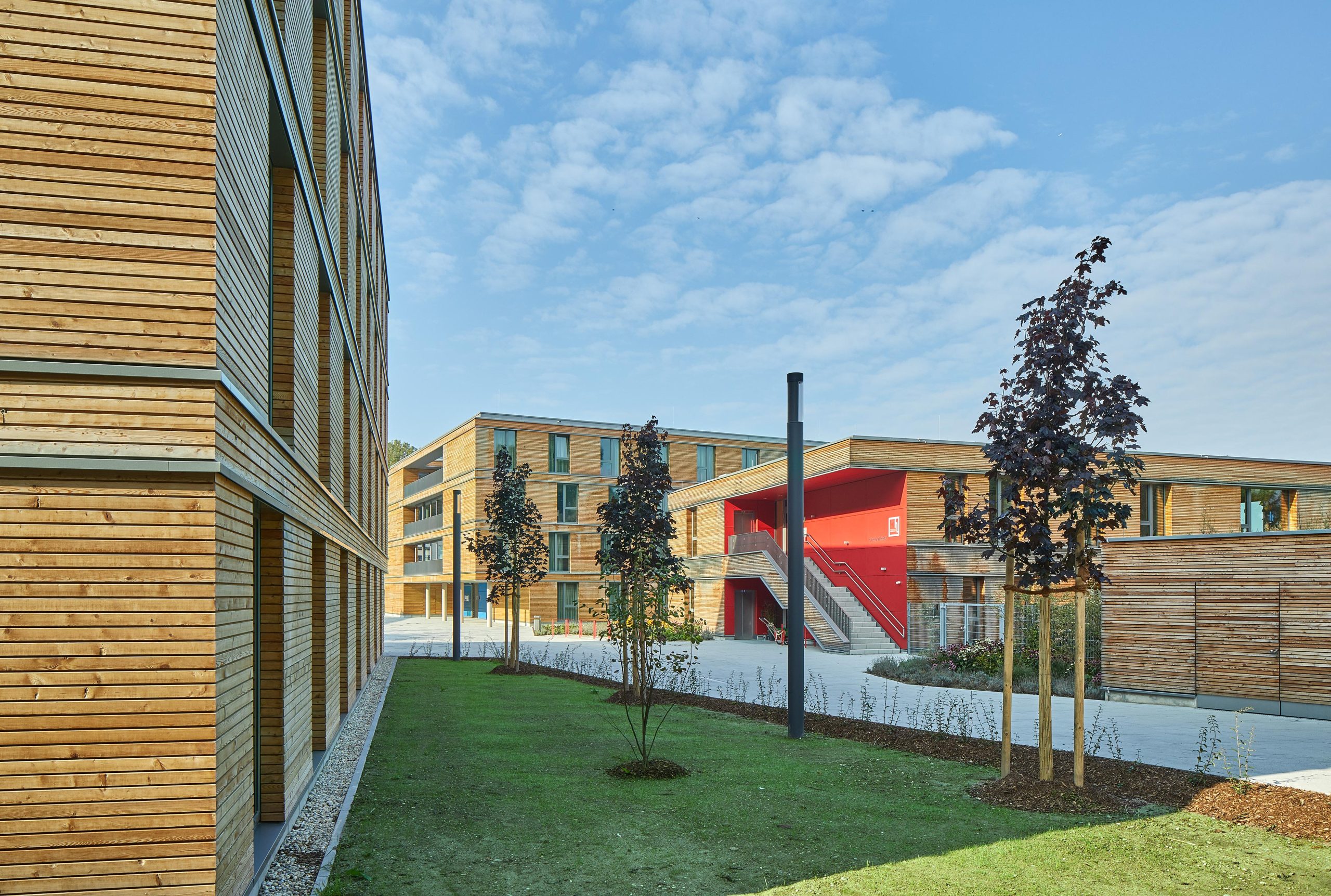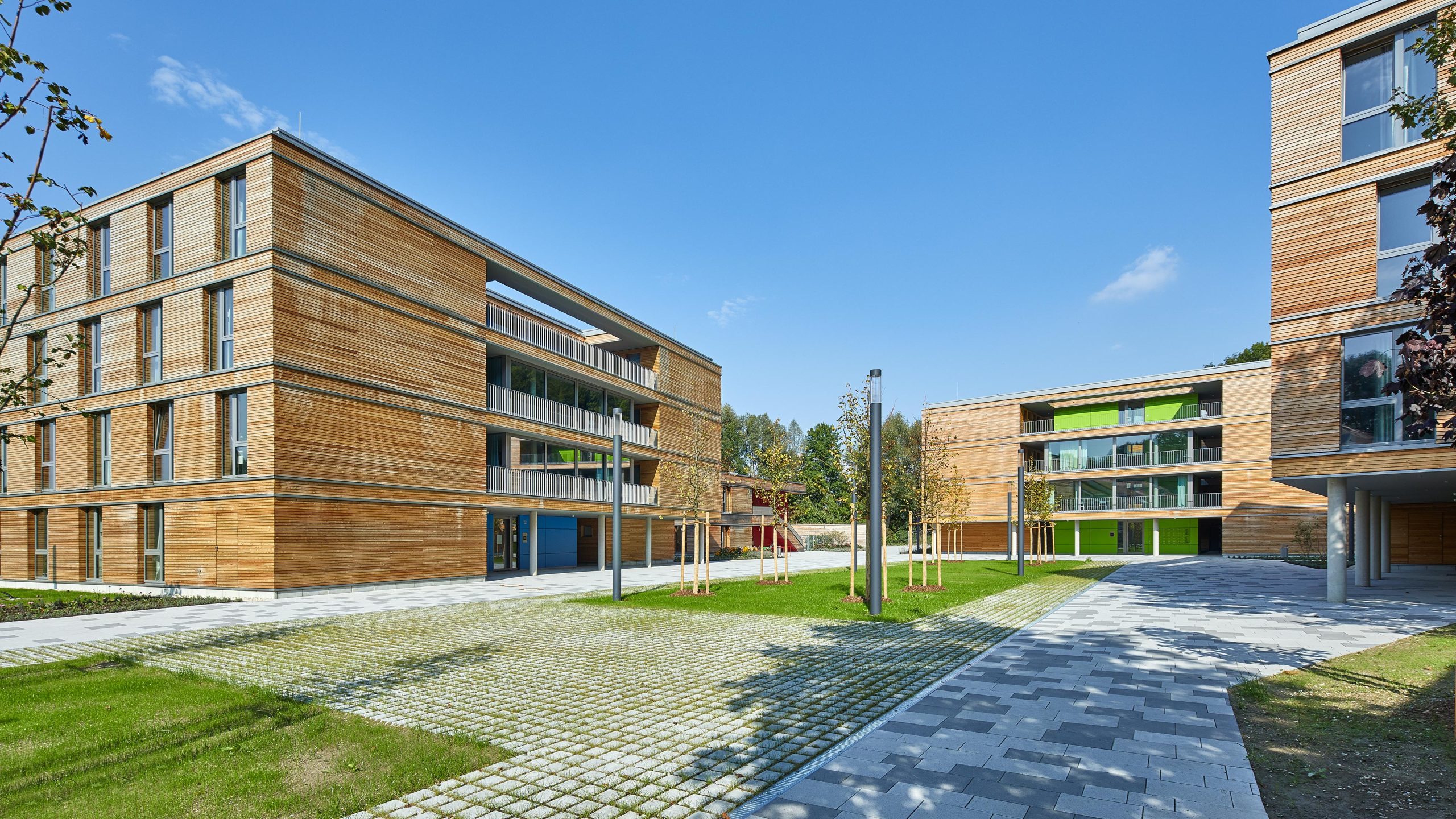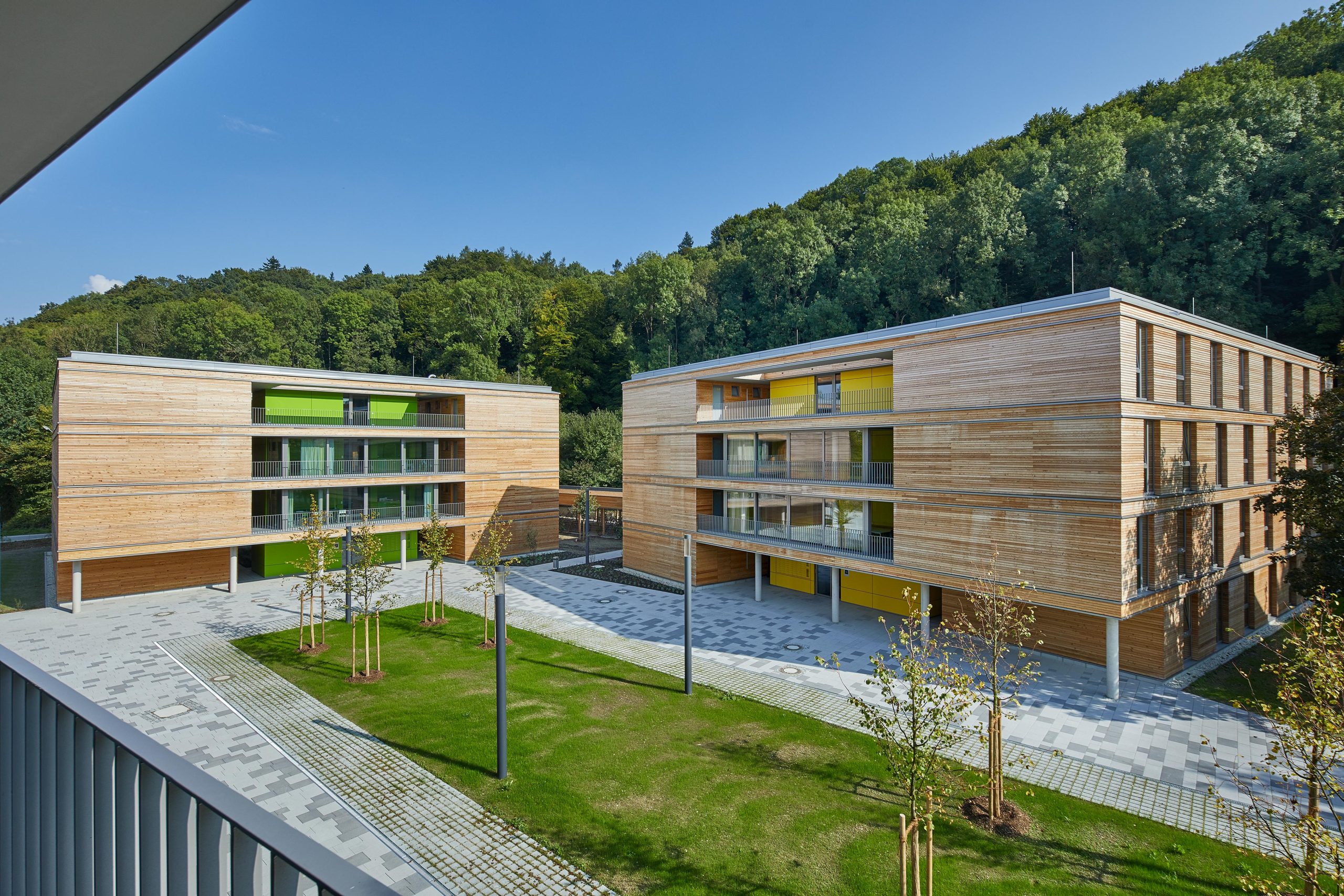 Die Lärchenholzfassaden werden durch Einschnitte und versetzende Fensteranordnungen rhythmisiert und gegliedert. Über abgestufte Farbmotive der Fassaden der Erschließungskerne, der Orientierungssysteme und der Möblierungen erhält jedes Gebäude in der Einheit einen individuellen Akzent.