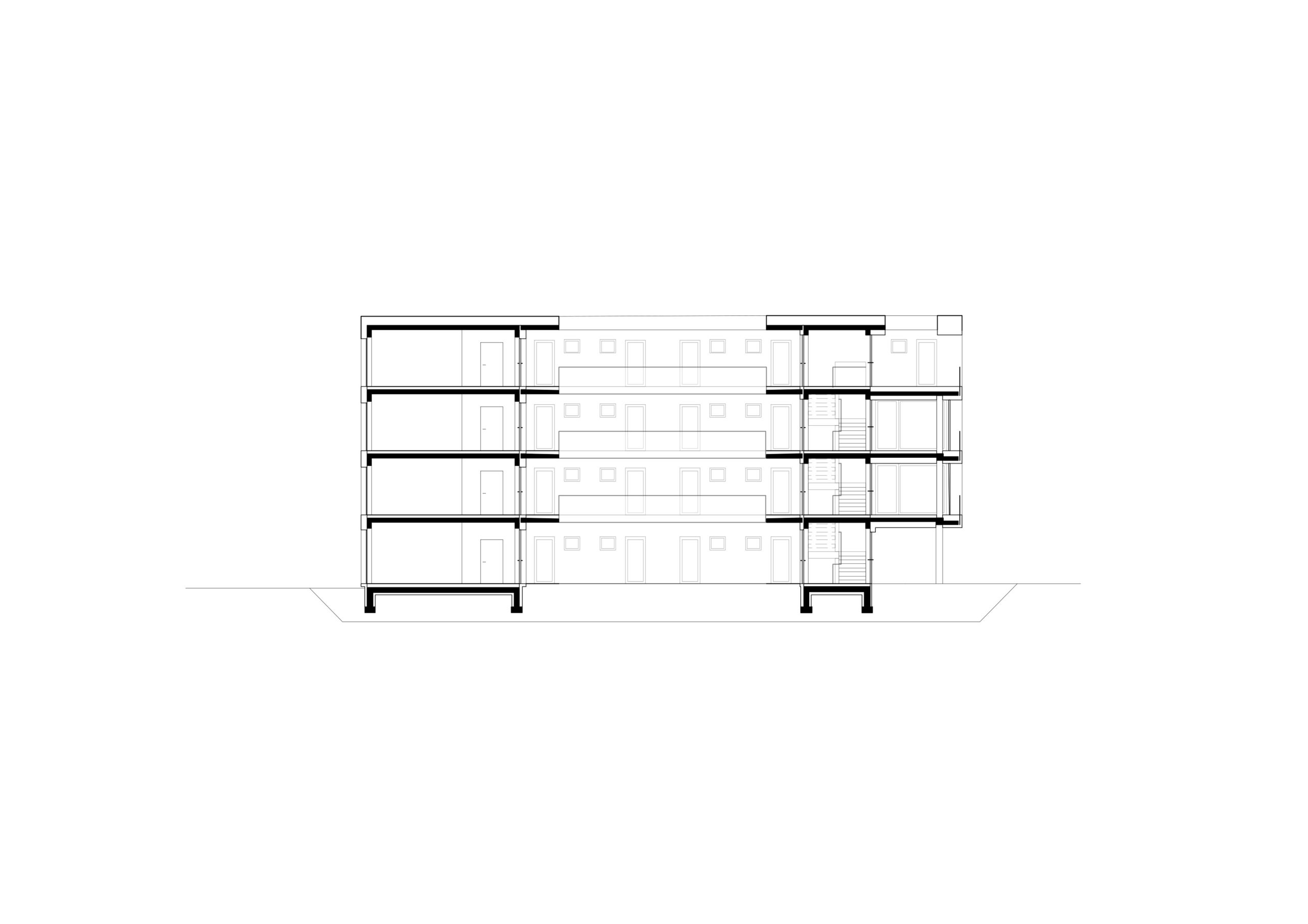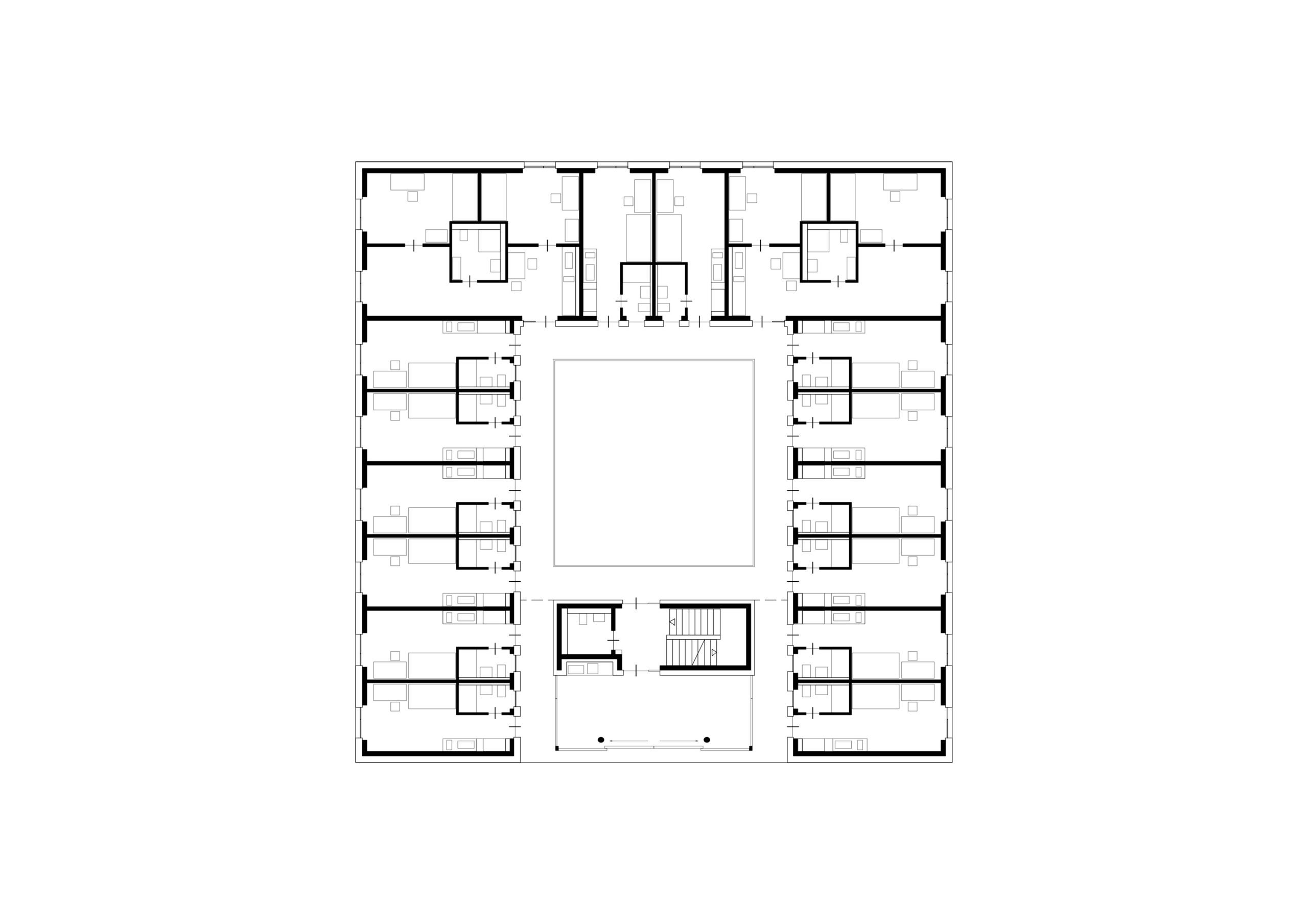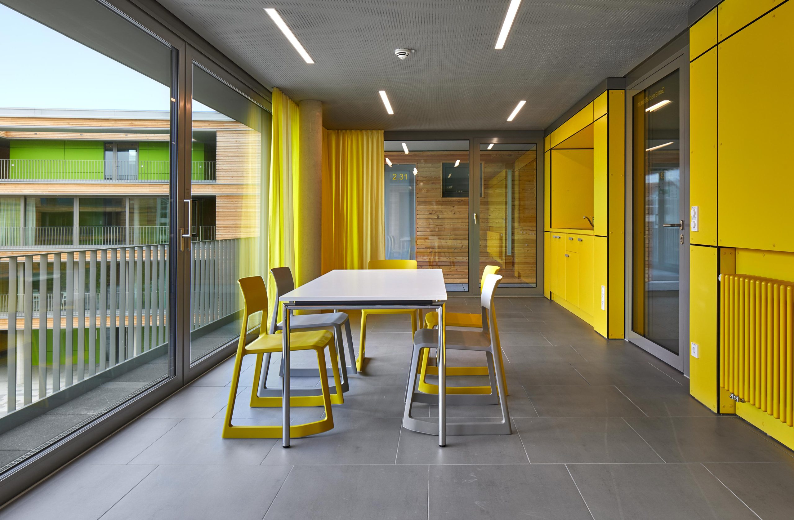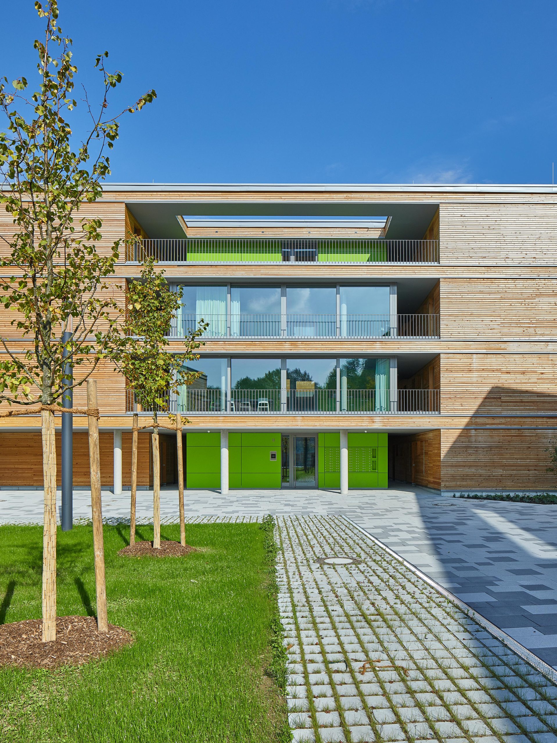 Die Erschließung der insgesamt 184 Apartments erfolgt über offene Laubengänge um lichte, grüne Innenhöfe. Zum gemeinschaftlichen Anger hin öffnen sich die Gebäude mit ihren Eingangsbereichen, großzügig mit Schiebeelementen verglasten Gemeinschaftsräumen und offenen Gemeinschaftsterrassen.
