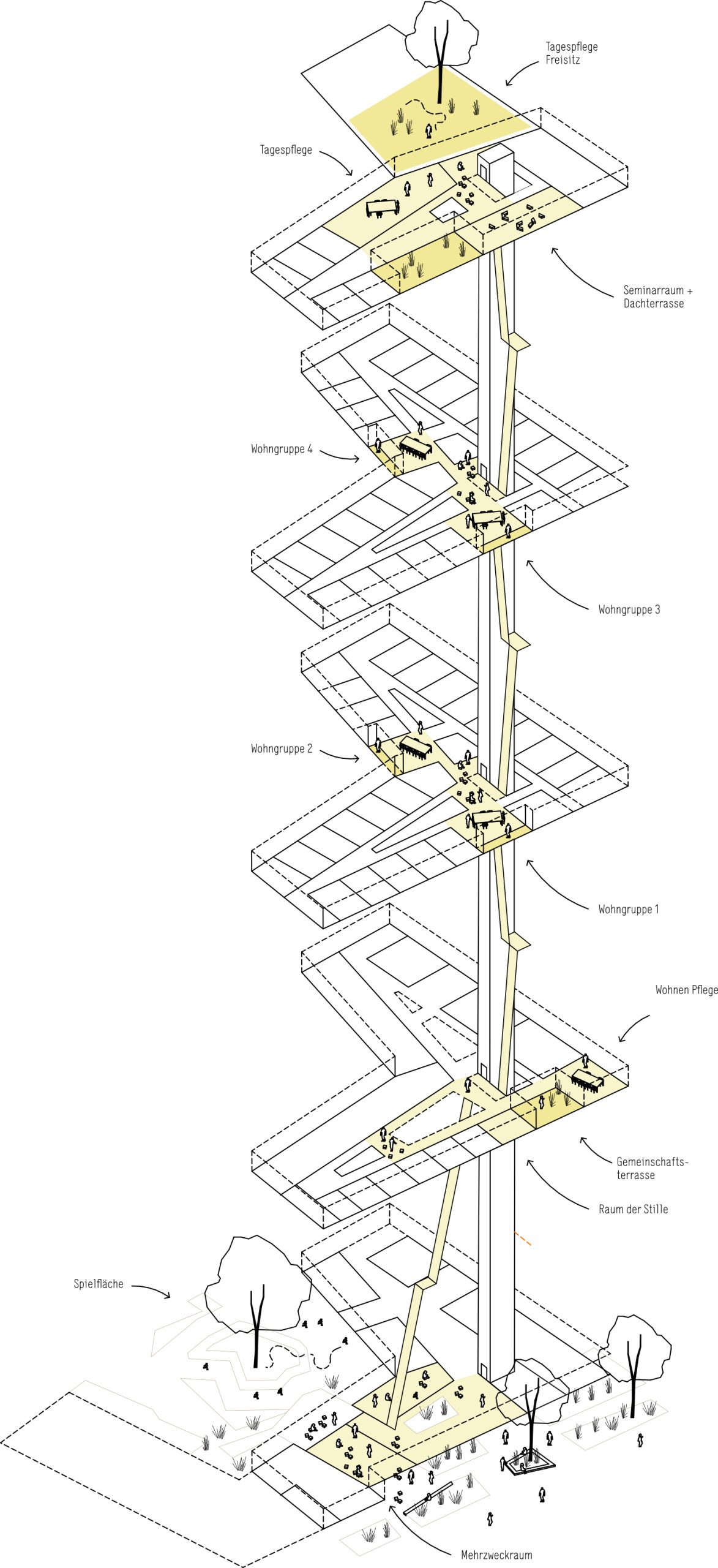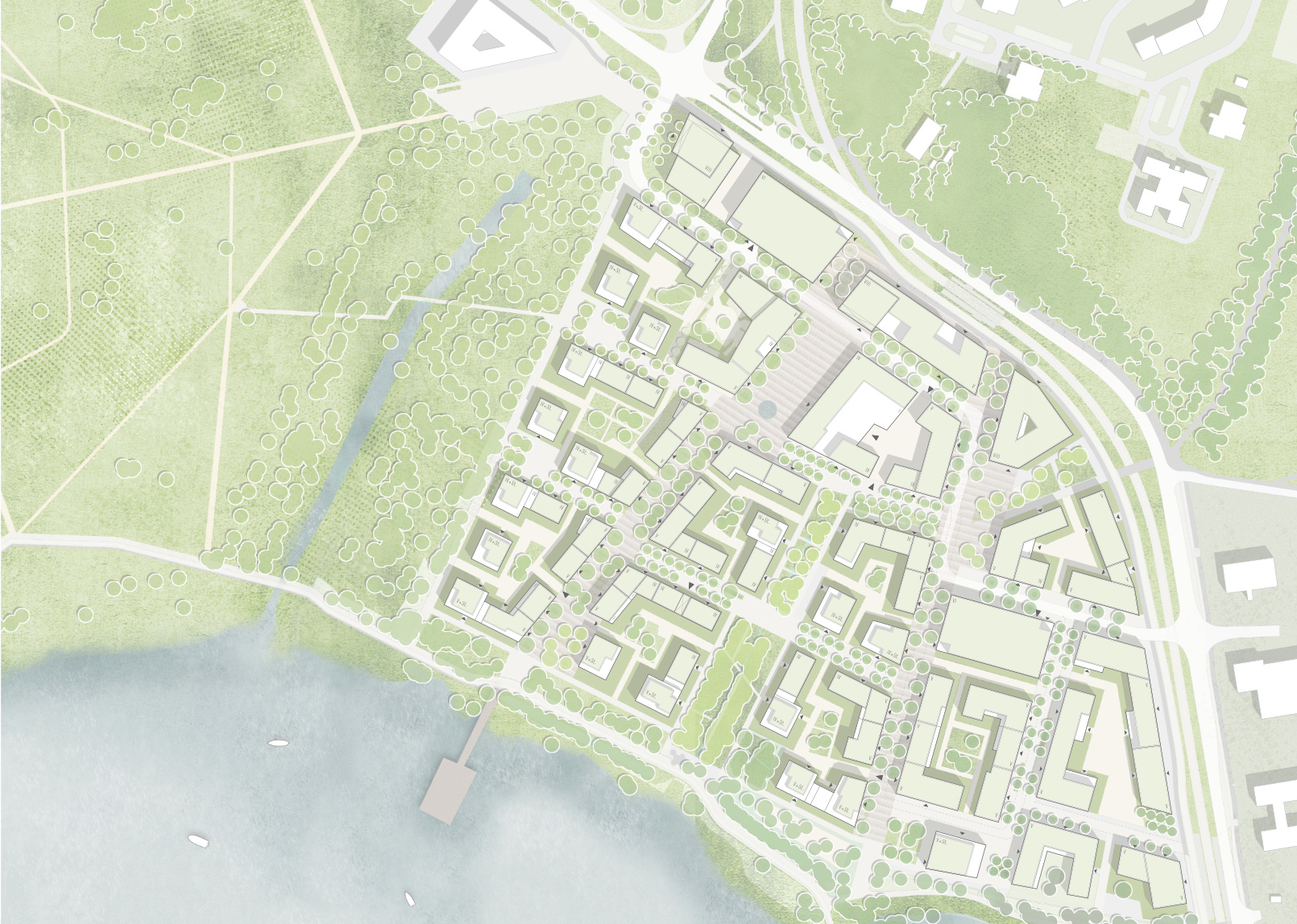 Die Ausbildung dieser Mitte tritt in der städtebaulichen Figur in Erscheinung durch die unmittelbar angelagerten Freiflächen mit tiefen Ein- und Ausblicken, die zum Quartiersplatz orientiert sind. Die städtebauliche Dominante am Platz wird zusätzlich unterstrichen durch die Differenzierung der Geschosse, zum Platz fünfgeschossig, staffelt sich das Gebäude entlang der Quartiersstraße ab.