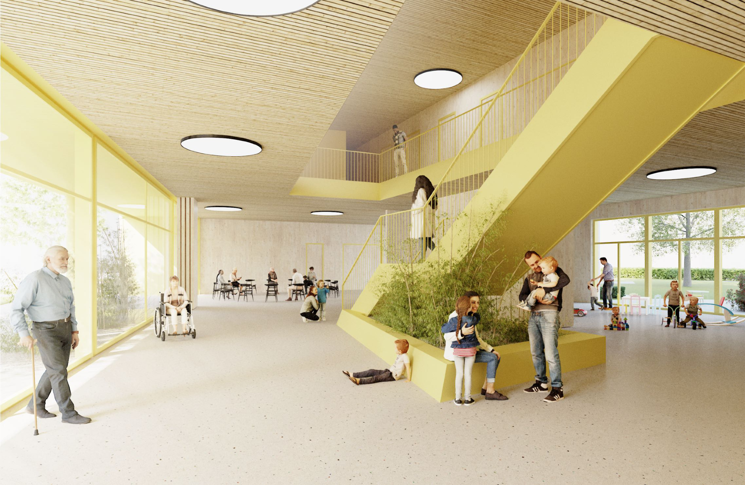 Orientierung, Heimat, Vernetzung sind die wesentlichen Leitbilder. Nachhaltige simple Konstruktionen und eine allseitig schöne Fassade am Platz und zum Hof sind obligatorisch.
