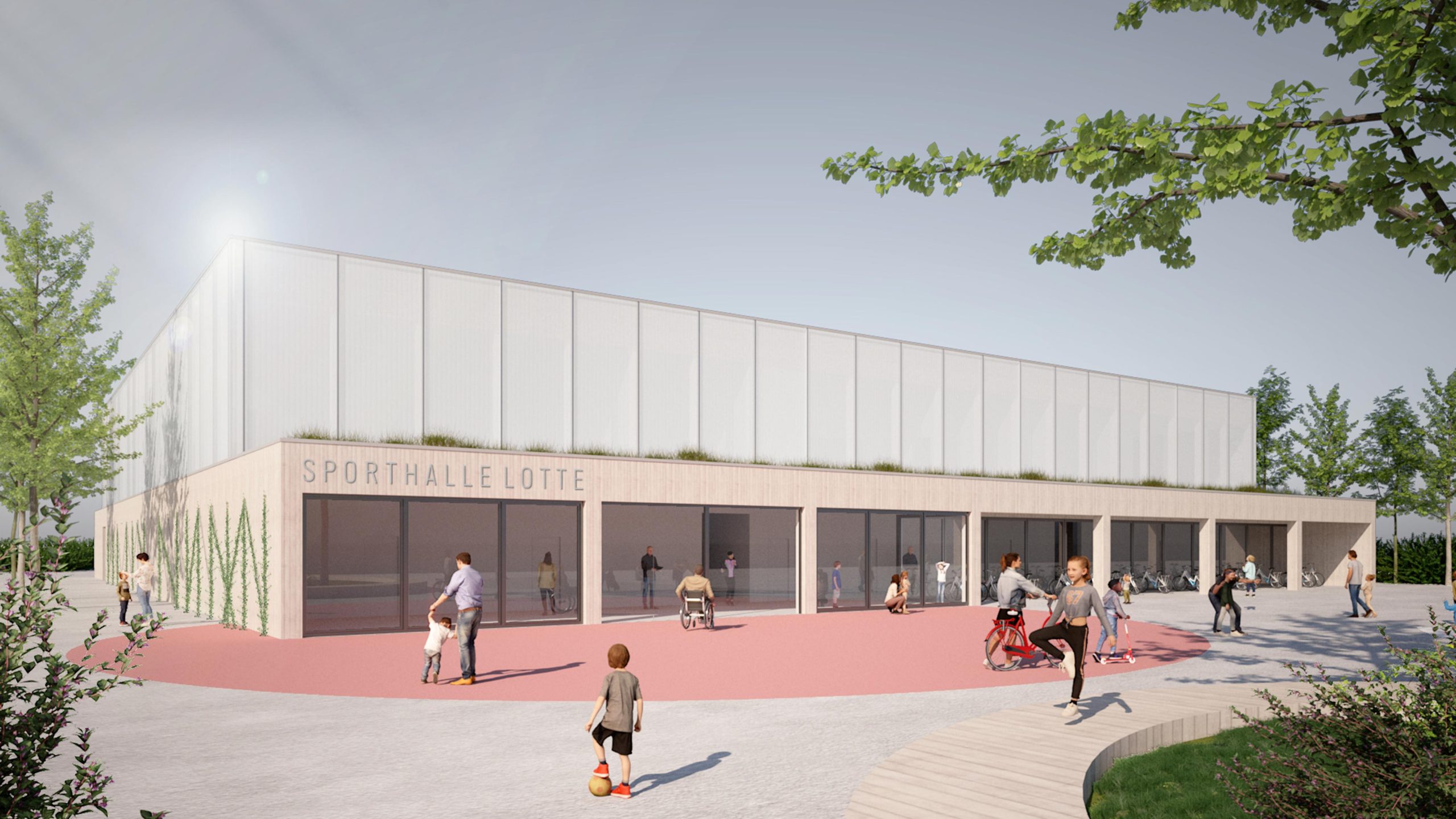 Die neue Dreifachsporthalle bildet den Auftakt zum künftigen Campus des Sportzentrums Lotte im Rahmen des Masterplans 2030. Sie dient als Schulsporthalle für die nördlich gelegene Grundschule und steht zugleich verschiedenen Sportvereinen sowie für Wettkampfveranstaltungen – insbesondere Handballmeisterschaften – zur Verfügung. In direkter räumlicher Nähe ergänzt eine privat betriebene Schwimmhalle auf dem gleichen Grundstück das sportliche Angebot.