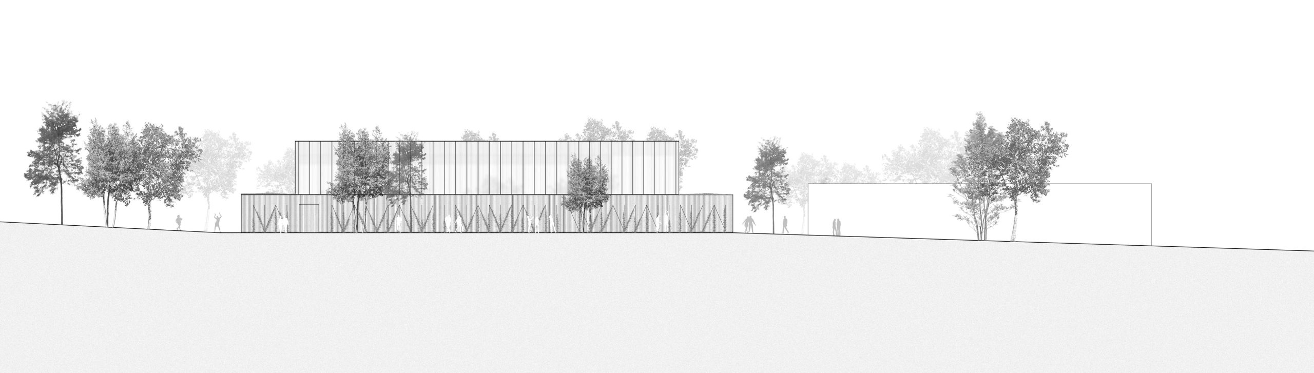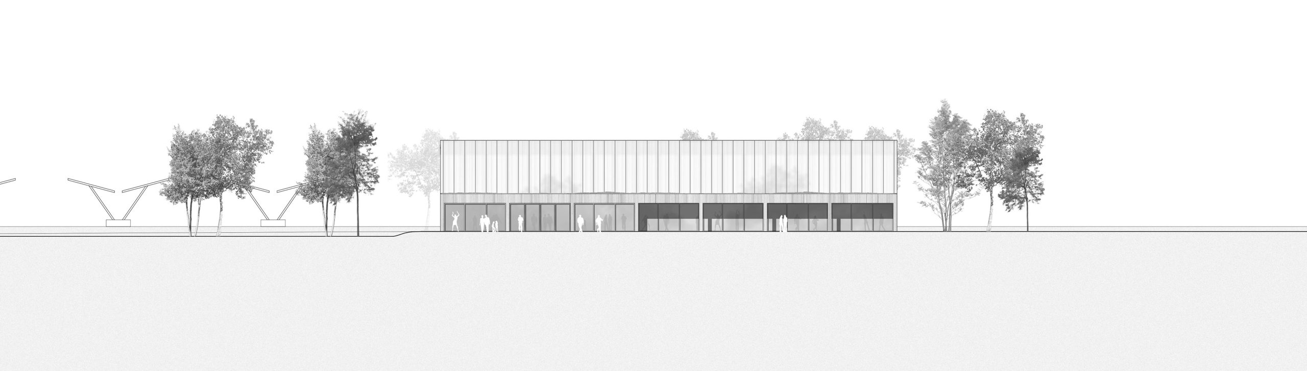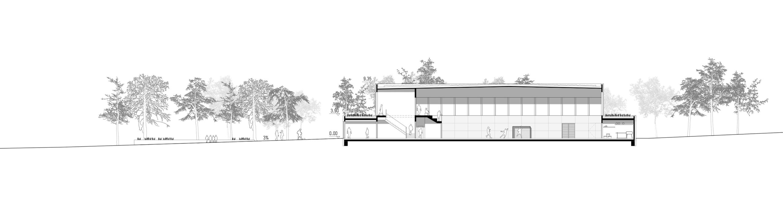 Die Sporthalle positioniert sich selbstbewusst an der höchsten Stelle des leicht ansteigenden Geländes im Süden des Grundstücks. Ihr deutlich größeres Volumen unterstreicht ihre zentrale Bedeutung. Die Schwimmhalle ist ihr im Nordwesten vorgelagert und nimmt räumlichen Bezug zur benachbarten Kubatur des Supermarkts.