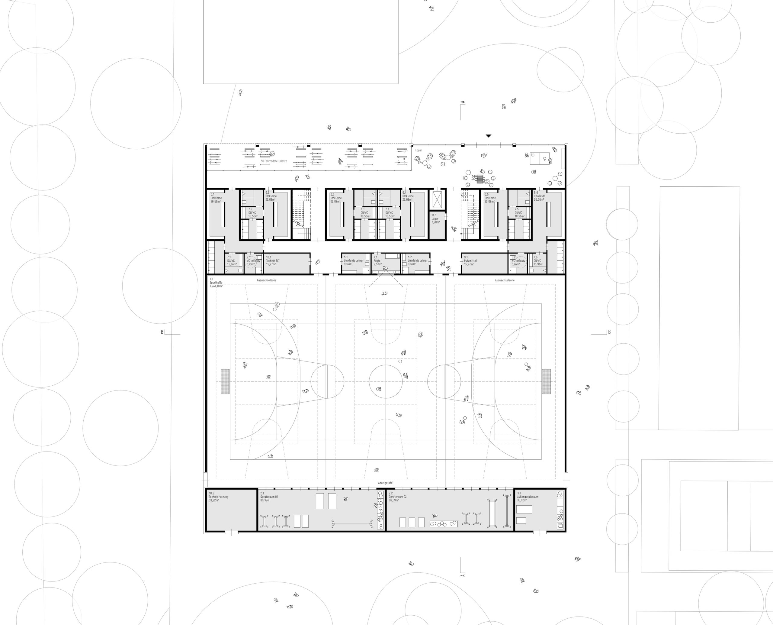 Die Dreifachsporthalle ist klar gegliedert und sorgt so für eine einfache Orientierung. Sämtliche Nutzbereiche liegen im EG, die Tribüne mit Teeküche/Ausschank im OG.